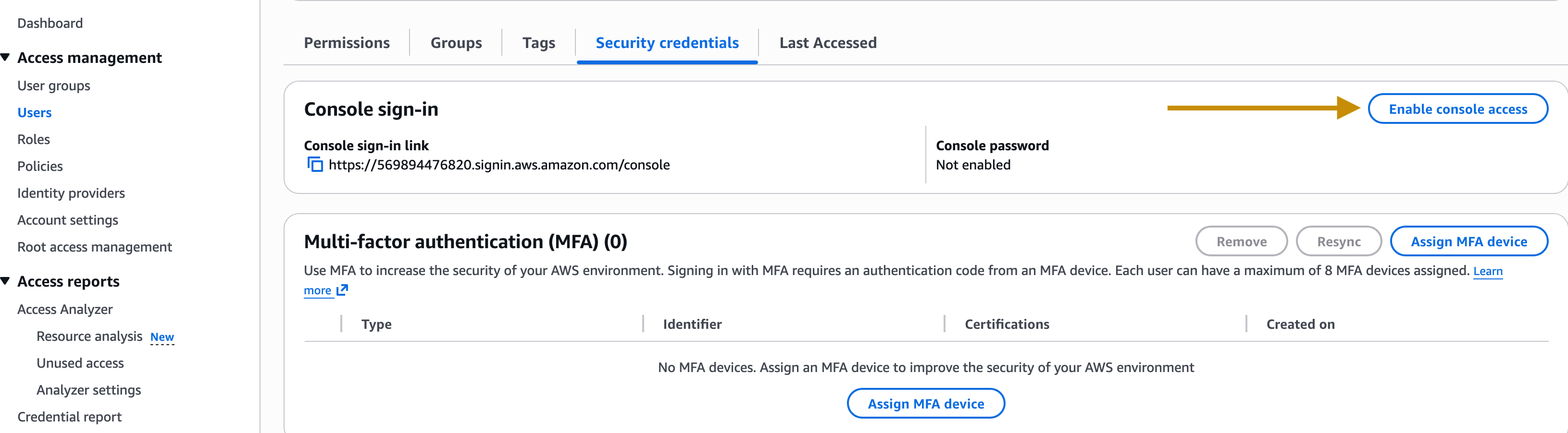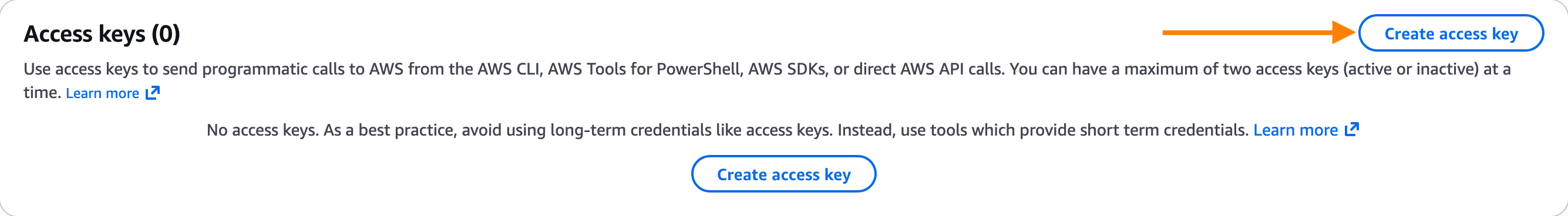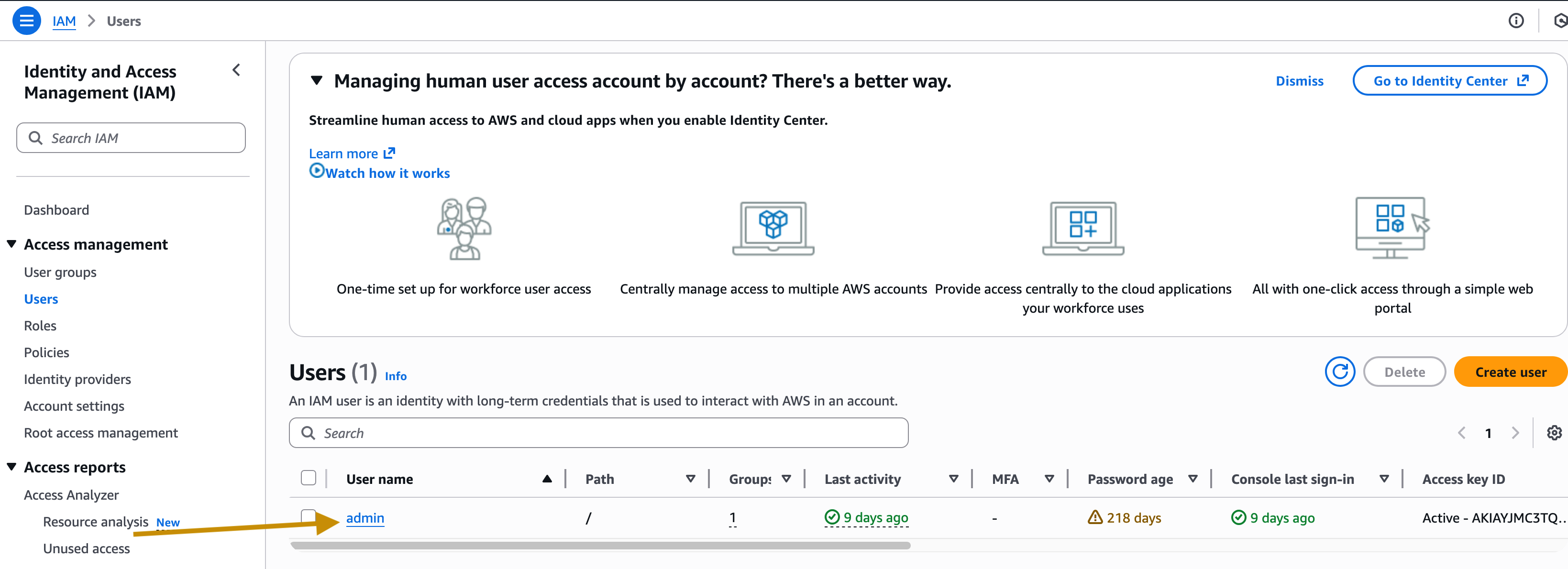 - Go to IAM —> Users —> admin. Select the Security credentials tab. Click the Create access key button.