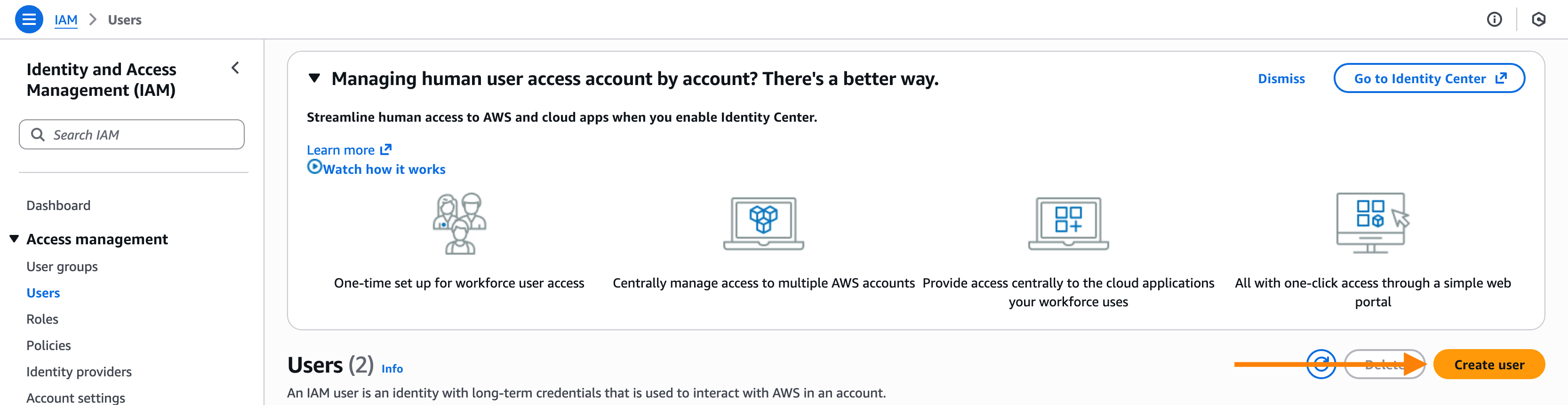 - Go to the IAM —> Users page. Click on the Create user button to create a new user.