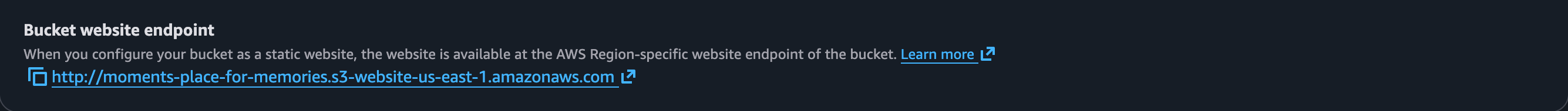 - Once Static website hosting is enabled, the corresponding endpoint is shown: