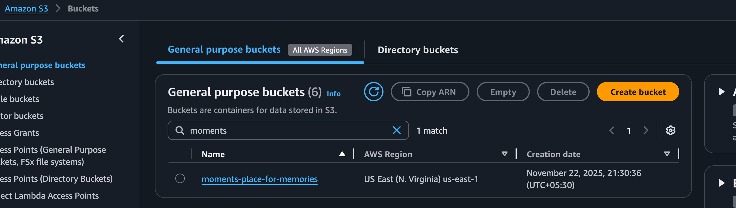 # Let’s create a bucket with unique name. frontend ~ aws s3api create-bucket --bucket moments-place-for-memories --region us-east-1 { "Location": "/moments-place-for-memories" } # Verify whether the bucket is created frontend ~ aws s3api list-buckets { "Buckets": [ { "Name": "moments-place-for-memories", "CreationDate": "2025-11-22T16:00:36+00:00", "BucketArn": "arn:aws:s3:::moments-place-for-memories" }, { "Name": "test-react-app-22nov-bucket", "CreationDate": "2025-11-22T15:21:55+00:00", "BucketArn": "arn:aws:s3:::test-react-app-22nov-bucket" } ], "Owner": { "ID": "c6e83317671833f41a0df538fd46af1b1bc41403f643c51e840fd879bf087c40" }, "Prefix": null }