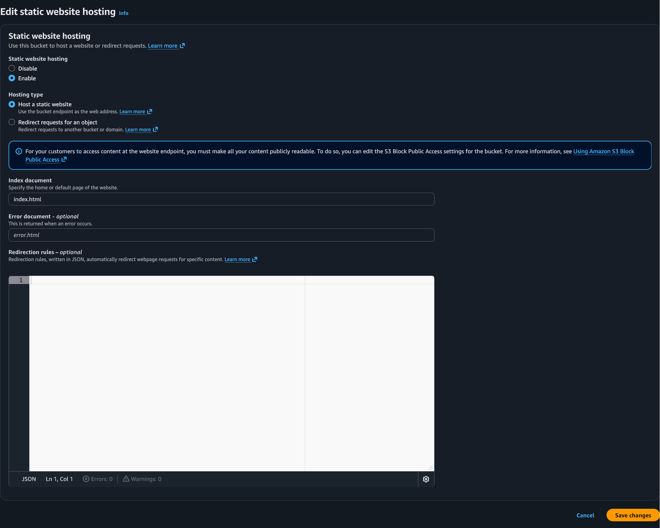 Select the index document as index.html and Save changes.