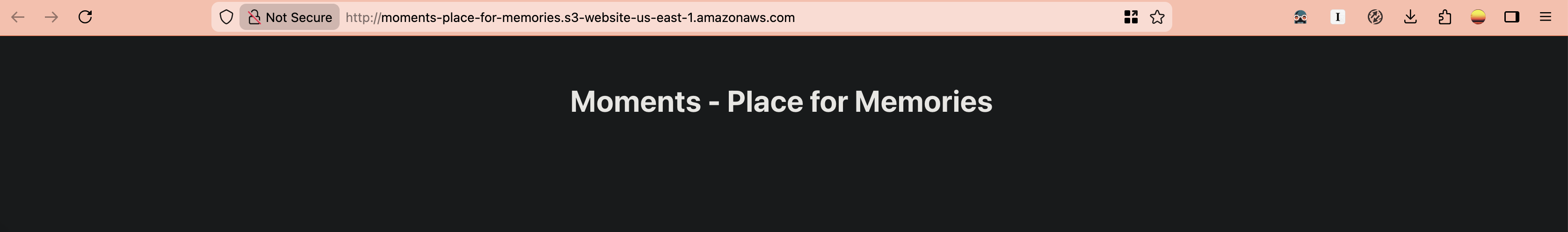 By default, all AWS resources are forbidden from read/write access for everyone except for S3 itself. For now, let’s enable read access for all. To do this, we need to add a Bucket policy.Copy the following with the appropriate bucket name into the Bucket policy section under the Permissions tab. Now, accessing the S3 static website endpoint again should show the following:{ "Version": "2012-10-17", "Statement": [ { "Sid": "PublicReadGetObject", "Effect": "Allow", "Principal": "*", "Action": "s3:GetObject", "Resource": "arn:aws:s3:::moments-place-for-memories/*" } ] }
