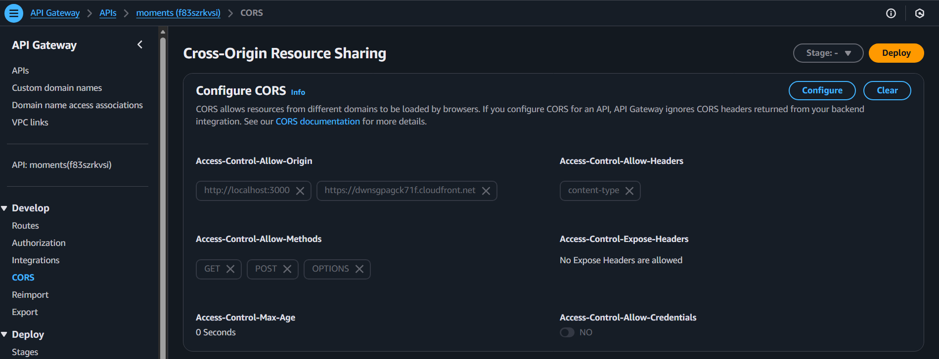 - Navigate to API Gateway –> APIs –> API: moments –> Cross-Origin Resource Sharing (CORS).