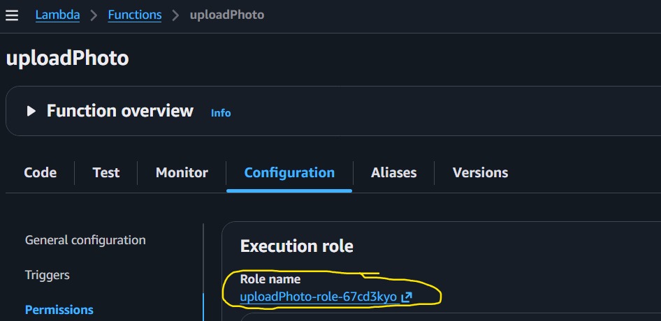 To update permissions for the uploadPhoto Lambda function: