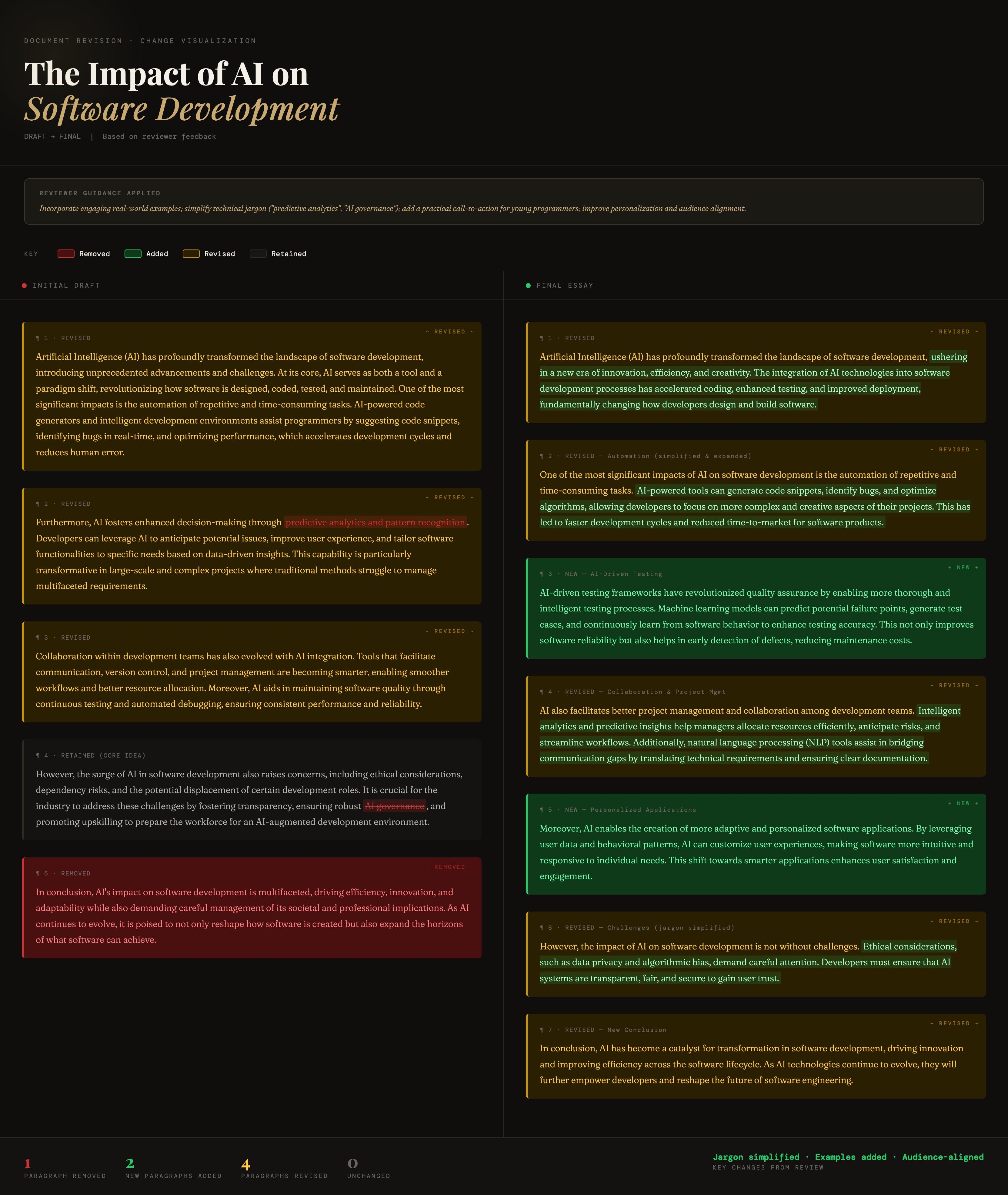To improve the essay's accessibility, especially for young programmers, it could benefit from incorporating more engaging examples and real-world use cases of AI tools commonly used in software development. Simplifying technical terms like "predictive analytics" and "AI governance" with clear explanations will help ensure better understanding.