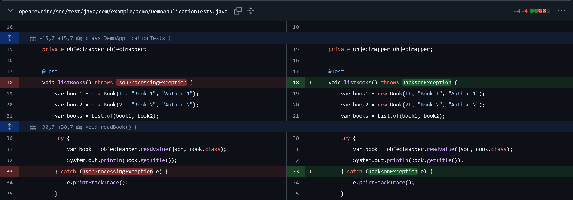 Here, it has made changes as per Jackson 3 migration. While making code changes, most importantly it hasn’t changed the formatting of the source file. This avoids unnecessary merge conflict errors.