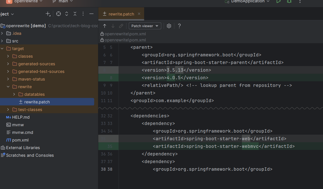 - Instead of running directly and changing the code base, we can also run OpenRewrite in dry-run mode to see the changes that will be made by the recipe.