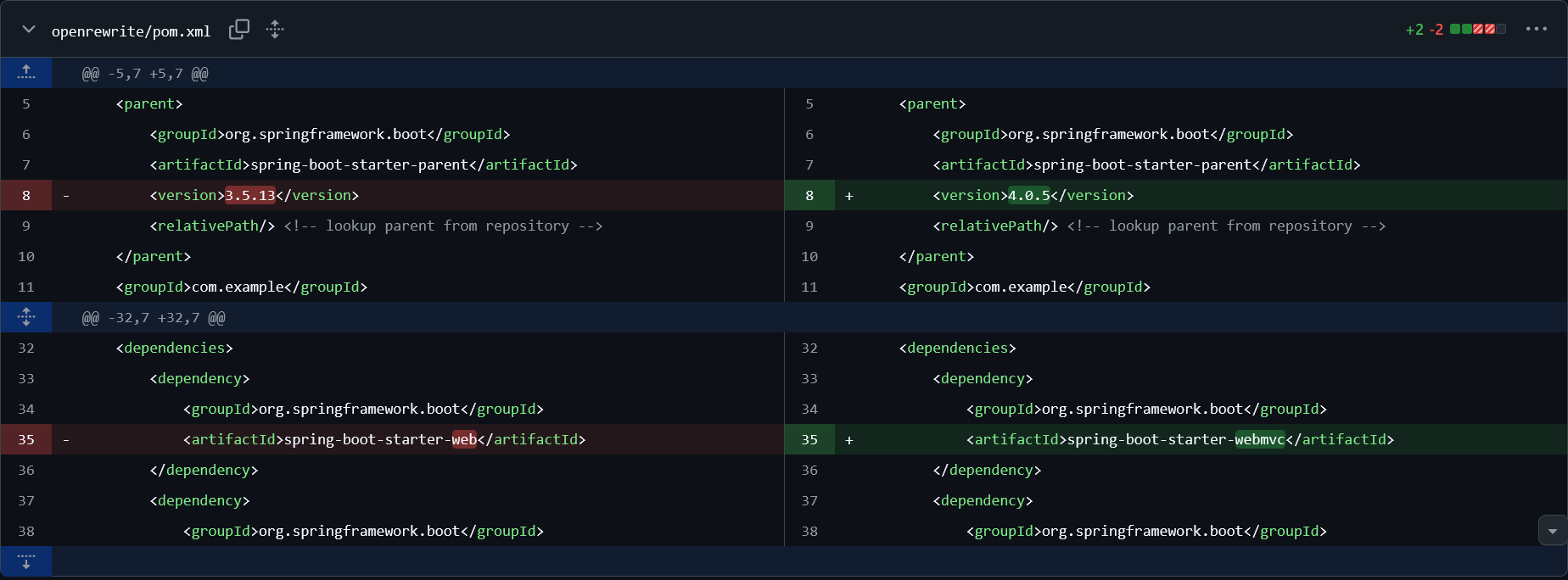 As we can see, OpenRewrite has updated the Spring Boot version and made related Spring module changes.