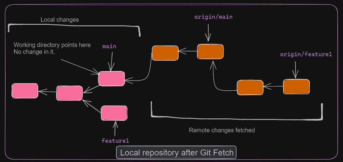 git fetch downloads content from remote but does not interfere with local changes in the working directory. With this, we can see the latest changes in remote branches.