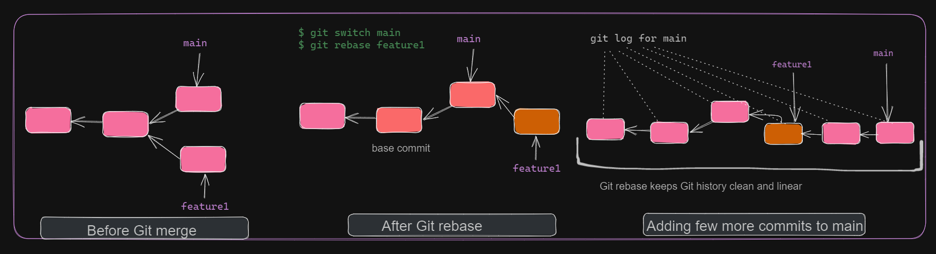 git rebase is similar to git merge. But instead of directly performing a 3-way merge, it first considers the target branch commits. Then, merges the current branch commit on top of it. This will ensure that the target branch commit history is intact. This is useful when debugging applications, where you can easily find the commit causing the issue.