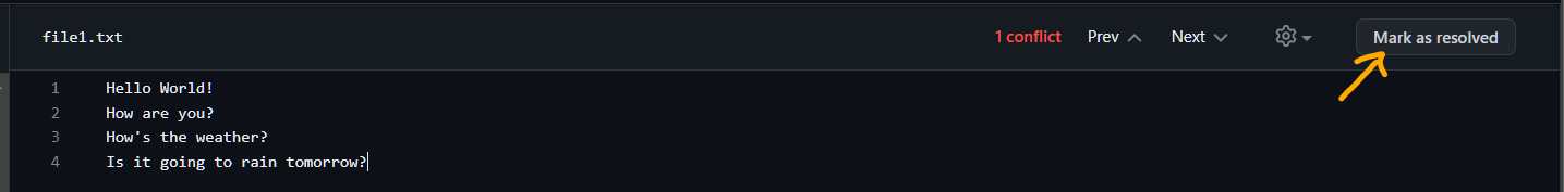 After resolving the changes, click on Mark as resolved and Commit merge.