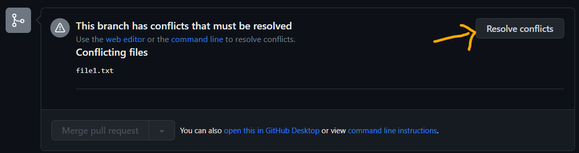 In some cases, changes in feature branch can conflict with the changes in base branch. Then, GitHub shows conflicting files. Need to resolve them manually.