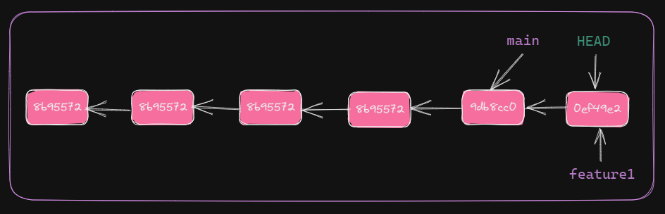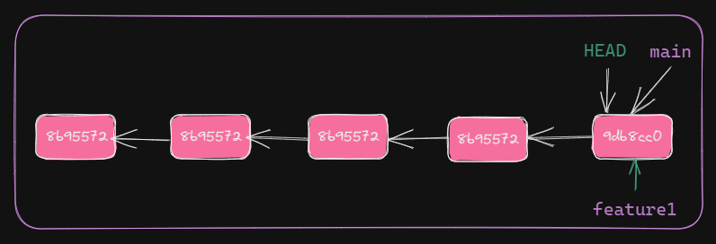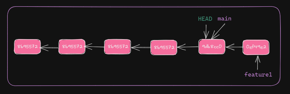 HEAD and main point to the latest commit. Also, changes in main and feature1 are diverged. This is part of collaborated development workflow.