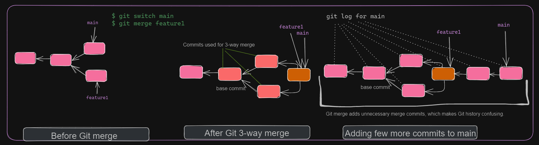 git merge creates merge commits if it’s a 3-way merge. This will introduce unnecessary merge commits in git history. Remember, git history can be checked with git log.