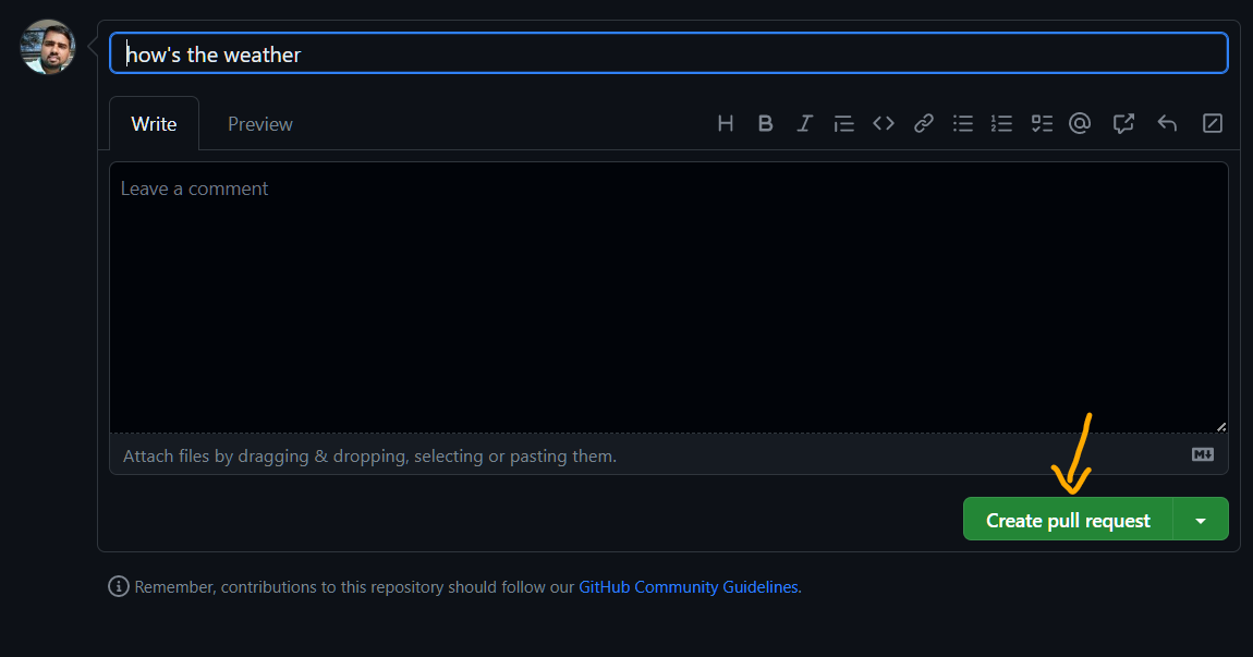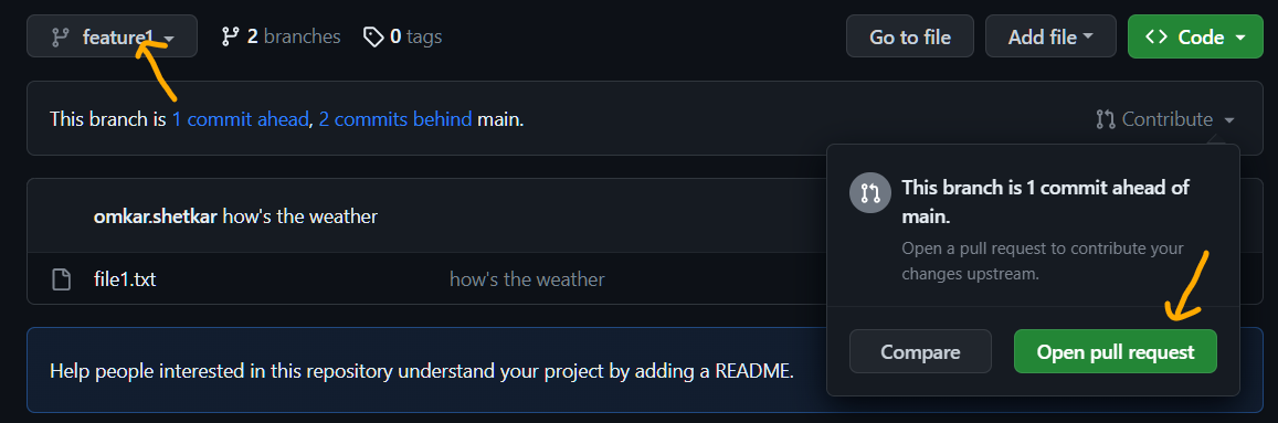 Now, we will raise a Pull Request (PR) on GitHub. With PR we can ask fellow developers to review code. Once everything is fine, we can merge the changes into base branch main.