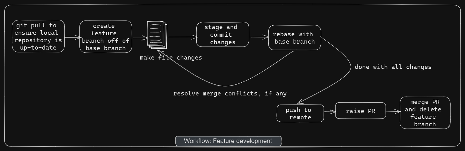 Finally, complete Git workflow of a feature development will be as follows. Clone the repository if not already done. If feature development takes time, then remember to rebase with base branch regularly. This will ensure that no or minimum conflicts occur in PR. After you are done with changes, stage and commit them. Push to remote. Raise a PR for peer code review. After all fine, merge the PR into base branch and delete the feature branch.