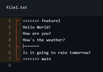 Now, HEAD is again pointing to the latest commit of main. Also, note that file1.txt doesn’t contain changes done in feature1. After switching branches, Git changes the working directory content.