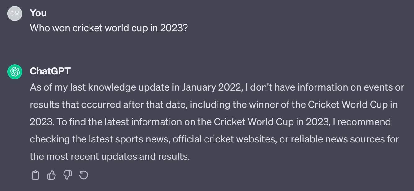 Let’s consider some knowledge that ChatGPT doesn’t yet know. As of today, Dec 7, 2023, ChatGPT is trained on data only up to January 31, 2022. Consequently, it’s unaware of any events or information after that date. For instance, when I asked it “Who won the Cricket World Cup in 2023?”, I received the following response: