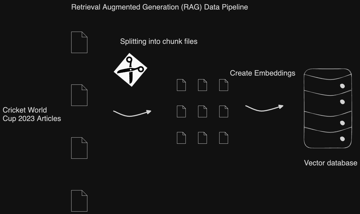 The input files are split into chunks containing plain text about the Cricket World Cup. This splitting is necessary because GPT prompts have limitations on the size of text that can be input. The resulting chunks are then encoded into binary format for storage in a vector database. These vector databases enable semantic search of the content, meaning they can assess how likely each chunk is to contain the answer to a given query.**
